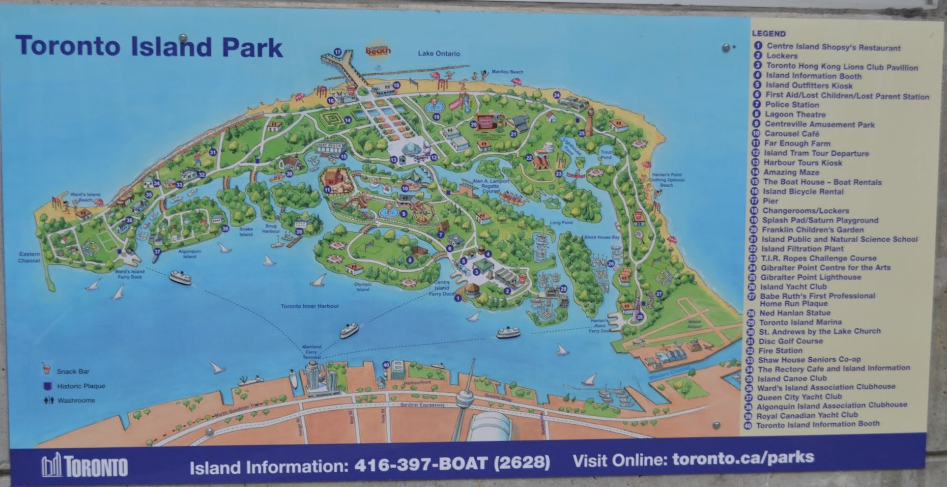 На днях нам всей семьей удалось побывать в сказочном месте — на островах Торонто. Это несколько компактно расположенных островов прямо напротив даунтауна Торонто (как можно видеть на карте схеме, даунтаун Торонто внизу карты).